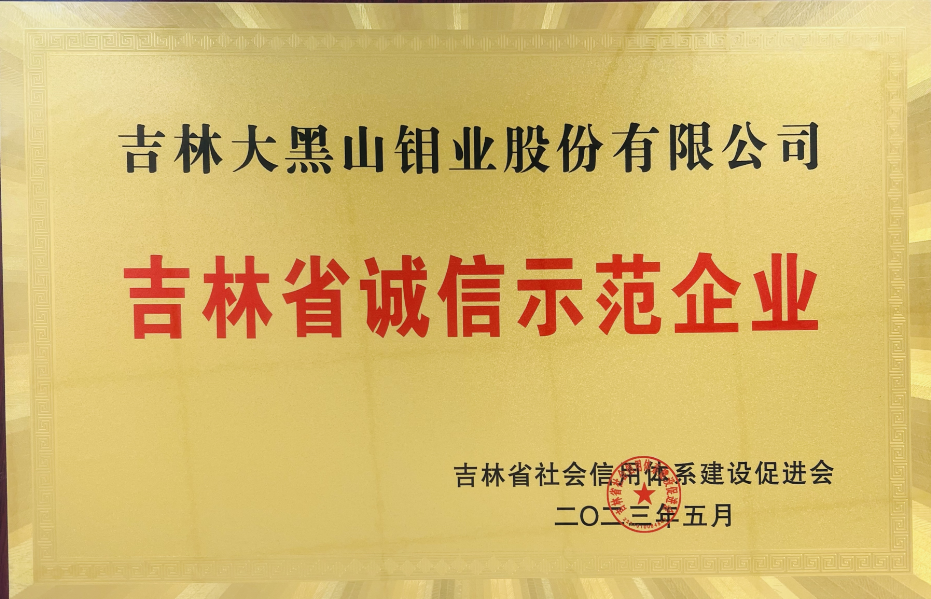 2023年5月,吉林省社會信用體系建設(shè)促進(jìn)會頒發(fā)了“吉林省誠信示范企業(yè)”榮譽證書,授予吉林大黑山鉬業(yè)股份有限公司“吉林省誠信示范企業(yè)”稱號,這一榮譽的獲得,是對大黑山鉬業(yè)始終高度重視企業(yè)信用建設(shè)、模范遵守職業(yè)道德和行業(yè)準(zhǔn)則,自覺維護(hù)誠實守信形象的肯定和認(rèn)可。